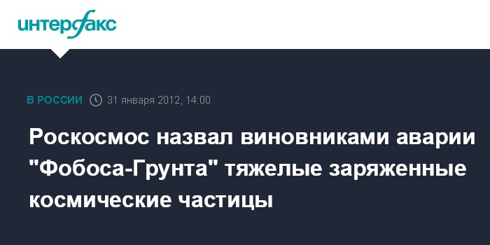 "Причиной нештатной ситуации стала перезагрузка двух бортовых вычислительных комплексов, так называемый двойной рестарт, поэтому "Фобос-Грунт" перешел в режим наибольшей экономии энергии и ожидания команд. Наиболее вероятной причиной, по мнению комиссии, является локальное воздействие тяжелых заряженных частиц космического пространства, которое привело к сбою в запоминающем устройстве центрального вычислительного комплекса еще на втором витке полета", - сказал Поповкин.