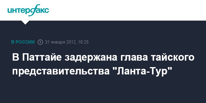 Москва. 31 января. INTERFAX.RU - В Таиланде арестовали управляющего директора представительства компании "Ланта-тур Тай", сообщил порталу "Интерфакс-Туризм" почетный консул РФ в Паттайе Виктор Кривенцов во вторник.