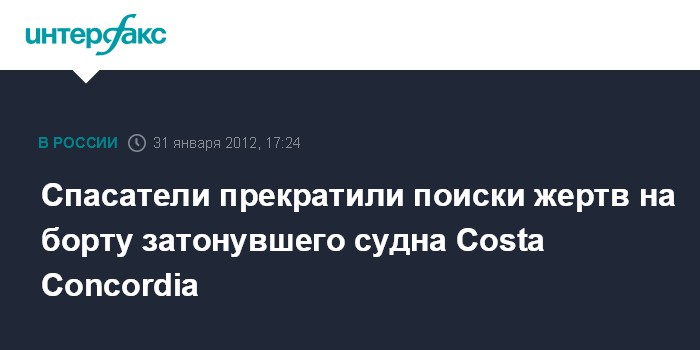 Лондон. 31 января. INTERFAX.RU - Итальянские спасатели объявили о завершении поиска тел погибших на борту затонувшего судна Costa Concordia, сообщила во вторник BBC.