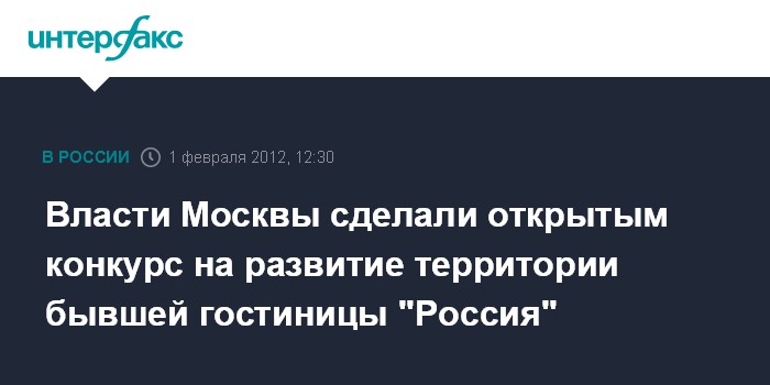 Москва. 1 февраля. INTERFAX.RU - Главный архитектор Москвы Александр Кузьмин объявил в среду открытие творческого конкурс на развитие территории бывшей гостиницы "Россия".