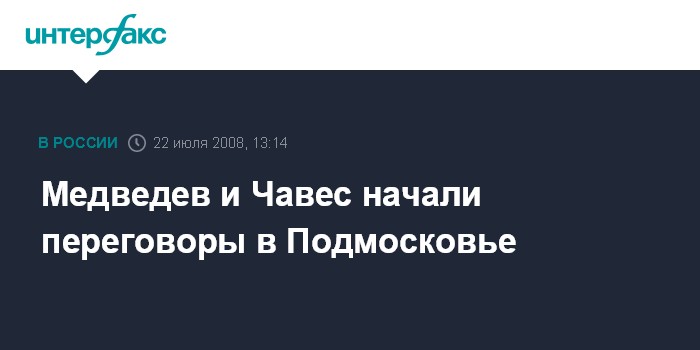 Москва. 22 июля. INTERFAX.RU - Встреча президента РФ Дмитрия Медведева и президента Венесуэлы Уго Чавеса началась во вторник в Подмосковье.