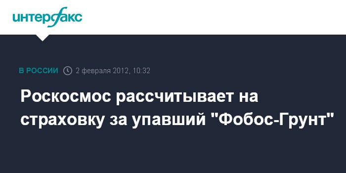 Москва. 2 февраля. INTERFAX.RU - "Роскосмос" намерен получить страховку в размере 1,5 млрд рублей за потерю межпланетной станции "Фобос-Грунт".