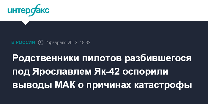 Москва. 2 февраля. INTERFAX.RU - Родственники пилотов Як-42, разбившегося 7 сентября прошлого года при вылете из Ярославля с хоккейным клубом "Локомотив" на борту, оспорили выводы Межгосударственного авиационного комитета (МАК) о причинах катастрофы, жертвами которой стали 45 человек.