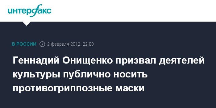 Москва. 2 февраля. INTERFAX.RU - Главный государственный санитарный врач России Геннадий Онищенко считает, что деятели культуры могли бы подать россиянам пример заботы о своем здоровье и публично носить противогриппозные маски.