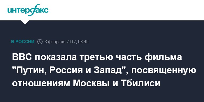 Лондон. 3 февраля. INTERFAX.RU - В эфир второго телеканала BBC вышла третья часть фильма - "Путин, Россия и Запад". Эта серия полностью посвящена отношениям России и Грузии: с момента прихода к власти в Тбилиси Михаила Саакашвили и до августовской войны 2008 года.