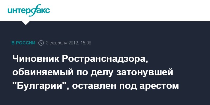 Казань. 3 февраля. INTERFAX.RU - Вахитовский районный суд Казани оставил под арестом обвиняемого по делу о крушении "Булгарии" бывшего главного госинспектора Казанского линейного отдела Волжского управления Госморречнадзора Владислава Семенова.