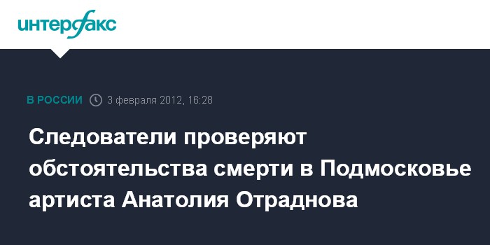 Москва. 3 февраля. INTERFAX.RU - Следственные органы Следственного комитета по Московской области начали доследственную проверку по факту смерти актера Анатолия Отраднова, доставленного на "Скорой" в подмосковную больницу в бессознательном состоянии.