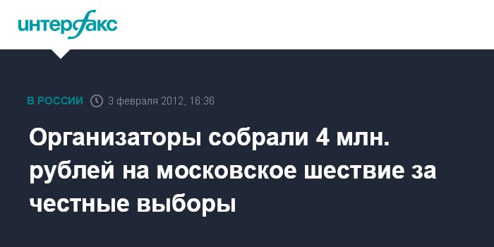 Москва. 3 февраля. INTERFAX.RU - Одна из организаторов митинга оппозиции "За честные выборы" Ольга Романова 4 февраля сообщила, что в Интернете собраны 4 млн. рублей на проведение акции.