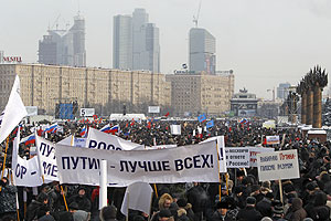 Сами участники акции отчетливо делились на две группы - те, кто пришел сюда сам, и те, кого "доставили". Последние несли изготовленные фабричным способом лозунги ("Мы в восторге от Путина", "Если не Путин, то кто?", "Даешь Путина! Даешь стабильность!" и так далее). Внутри этой группы выделялись отряды, посланные разными организациями - например, агропромышленным холдингом "Русское молоко", девелоперской группой ПИК или легендарной спортшколой "Самбо-70". Среди народных масс представители этих групп отличались формой и корпоративными знаменами.