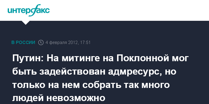 "Что касается самого участия такого количества людей, то, конечно, когда что-то организуется властью, то всегда говорят об административном ресурсе. Не исключаю, что и здесь какие-то элементы этого ресурса были, но собрать 134 или 190 тысяч человек на одном ресурсе невозможно, невозможно", - заявил В.Путин, отвечая на вопросы журналистов в ходе рабочей поездки в Челябинскую область.