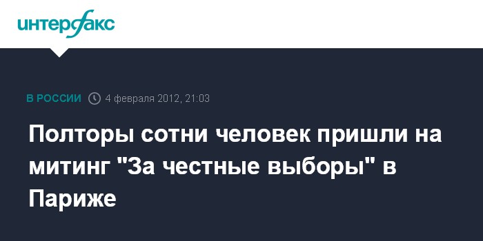 Париж. 4 февраля. ИНТЕРФАКС - Около 150 человек в субботу собрались в центре Парижа на митинг "За честные выборы в России", передает корреспондент "Интерфакса".