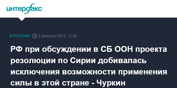 Москва. 5 февраля. INTERFAX.RU - Российская сторона при рассмотрении в СБ ООН проекта резолюции по Сирии исходила из того, что данный документ не должен послужить поводом для применения военной силы в этой арабской стране.