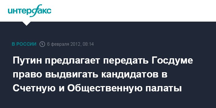 Москва. 6 февраля. INTERFAX.RU - Премьер РФ, кандидат в президенты Владимир Путин предлагает изменить порядок формирования Счетной и Общественной палат, передав соответствующие полномочия от главы государства парламенту.