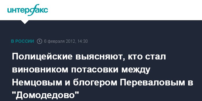 Москва. 6 февраля. INTERFAX.RU - Транспортная полиция приступила к проверке инцидента, произошедшего в минувшие выходные в аэропорту "Домодедово" между оппозиционером Борисом Немцовым и блогером Максимом Переваловым.