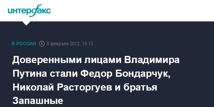 Также доверителями Путина стали народная артистка Надежда Бабкина, режиссер Федор Бондарчук, главный редактор газеты "Московский комсомолец" Павел Гусев, член Общественной палаты и председатель общественного совета при Главке столичной полиции Ольга Костина, адвокат Анатолий Кучерена, вокалист группы "Любэ" музыкант Николай Расторгуев, ректор МГУ Виктор Садовничий, а также дрессировщики братья Запашные.