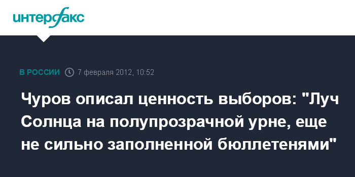 "Если луч Солнца попадает под определенным углом на полупрозрачную избирательную урну, еще не сильно заполненную бюллетенями, то получается редкое оптическое явление - очень красивое. Можно поймать и художественный кадр", - сказал Чуров во вторник на встрече с фотокорреспондентами российских СМИ.