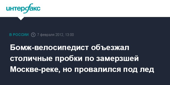 Москва. 7 февраля. INTERFAX.RU - Спасатели вытащили из Москвы-реки бомжа, провалившегося под лед на велосипеде, сообщил "Интерфаксу" источник в правоохранительных органах.