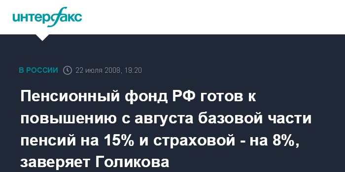 Пенсионный фонд РФ готов к повышению с августа базовой части пенсий на 15% и страховой - на 8%, заверяет Голикова