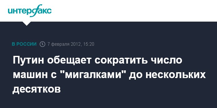 Москва. 7 февраля. INTERFAX.RU - Премьер РФ, кандидат в президенты Владимир Путин пообещал в случае победы на выборах 4 марта сократить количество машин с "мигалками" до нескольких десятков.
