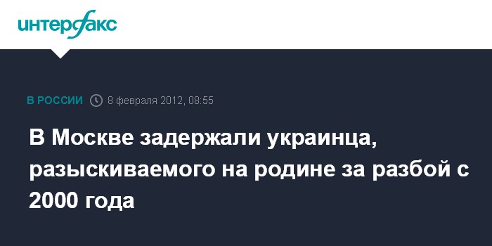Москва. 8 февраля. INTERFAX.RU - Московские полицейские задержали выходца из Украины, который разыскивался за разбой, вымогательство и умышленное уничтожение чужого имущества более 10 лет, сообщил "Интерфаксу" в среду источник в правоохранительных органах в среду.
