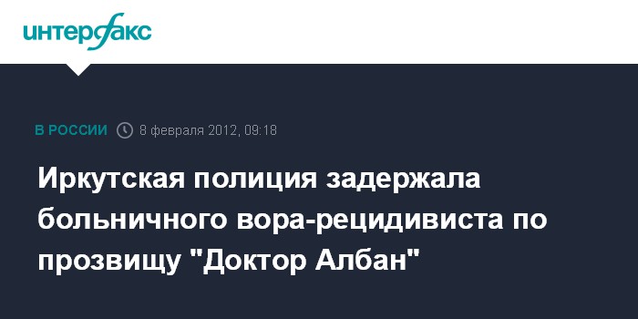 Иркутская полиция задержала больничного вора-рецидивиста по прозвищу "Доктор Албан"