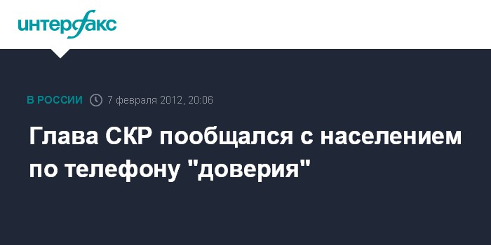 Москва. 7 февраля. INTERFAX.RU – Глава Следственного комитета РФ Александр Бастрыкин принимал во вторник звонки от населения по телефону "доверия", сообщил официальный представитель СК РФ Владимир Маркин. "Сегодня с 14:00 до 18:00 в ходе прямой линии телефонной связи Александру Бастрыкину позвонили 22 человека из различных регионов страны. С каждым из позвонивших Александр Иванович общался от 2 до 20 минут", - сказал Маркин "Интерфаксу".