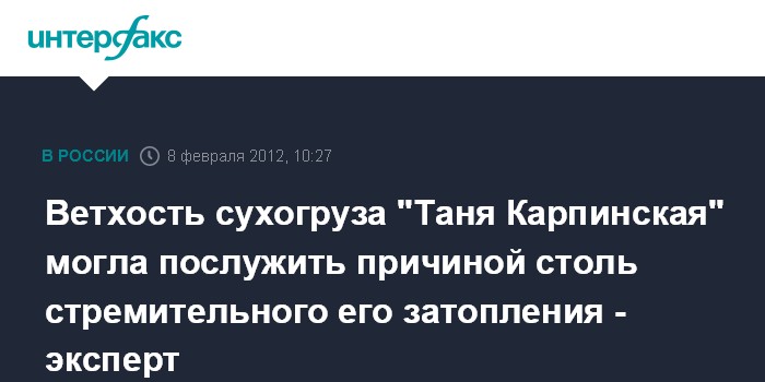 Владивосток. 8 февраля. INTERFAX.RU - Стремительное затопление российского сухогруза "Таня Карпинская" у японского порта Ниигата могло произойти из-за старости судна, которое не выдержало удар сингапурского контейнеровоза, считает президент Дальневосточной ассоциации морских капитанов Петр Осичанский.