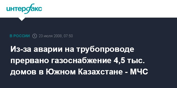 Астана. 23 июля. ИНТЕРФАКС-КАЗАХСТАН - В поселке Абай Южно- Казахстанской области в результате утечки газа из газопровода часть домов отключена от централизованного газоснабжения, сообщили в среду в МЧС Казахстана.