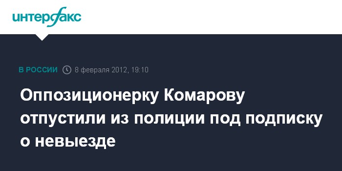 "Активистка "Другой России" Ольга Комарова, задержанная вчера вечером на прошедшей у Центризбиркома акции протеста против нелегитимных президентских выборов, освобождена под подписку о невыезде. Адвокату Виолетте Волковой удалось убедить следствие не выходить на арест", - сообщил в среду "Интерфаксу" член исполкома незарегистрированной партии "Другая Россия" Александр Аверин.