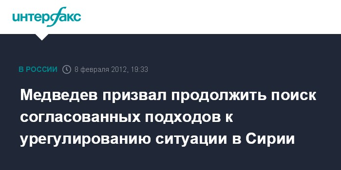 "Медведев, детально разъяснив позицию России, подчеркнул необходимость продолжения - в том числе в Совете Безопасности ООН - поиска согласованных подходов в целях содействия урегулированию кризиса самими сирийцами, без внешнего вмешательства, при полном уважении суверенитета Сирии", - сообщила пресс-служба главы государства.