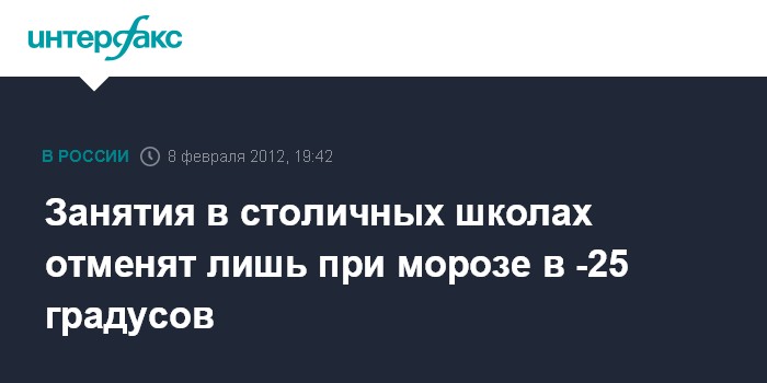 Москва. 8 февраля. INTERFAX.RU - Учебные занятия в столичных общеобразовательных учреждениях будут проводиться в обычном режиме, пока температура не достигнет отметки -25 градусов, говорится в сообщении, опубликованном на официальном сайте департамента образования столицы.