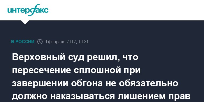 Москва. 9 февраля. INTERFAX.RU - Верховый суд РФ не стал рекомендовать низшим инстанциям лишать водителей прав на управление транспортным средством при выявлении любого факта завершения обгона, начатого через прерывистую полосу и законченного через сплошную.