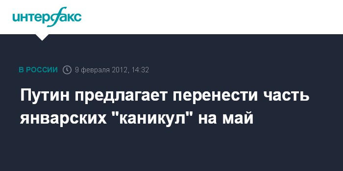 Москва. 9 февраля. INTERFAX.RU - Глава правительства РФ Владимир Путин предложил рассмотреть вопрос о возможности сокращения новогодних и рождественских праздников до 7 января.
