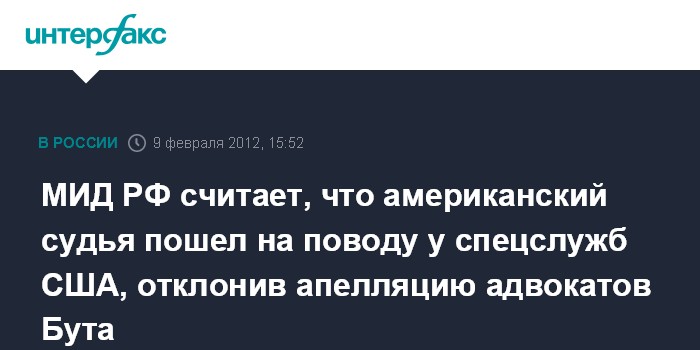 Москва. 9 февраля. INTERFAX.RU - МИД России считает, что суд Нью-Йорка пошел на поводу у американских спецслужб, отклонив апелляцию адвокатов российского бизнесмена Виктора Бута.