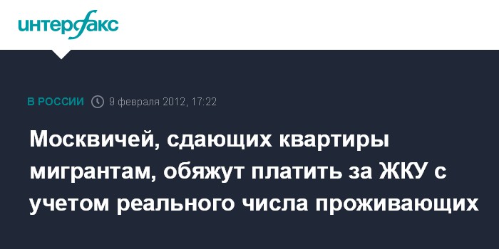 Москва. 9 февраля. INTERFAX.RU - Хозяева квартир в Москве, которые сдают их гастарбайтерам, заплатят за коммунальные услуги за каждого проживающего, заявил руководитель департамента ЖКХ и благоустройства столицы Андрей Цыбин.