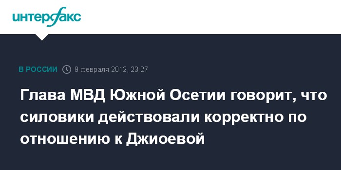 Цхинвали. 9 февраля. INTERFAX.RU - Глава МВД Южной Осетии Валерий Валиев заявляет, что физического воздействия к лидеру оппозиции Алле Джиоевой не применялось. "В ходе оперативно-следственных мероприятий, которые проводились сегодня в штабе лидера оппозиции Аллы Джиоевой, сотрудники силовых структур действовали корректно, в рамках закона, без применения физического воздействия в отношении Джиоевой. Мы категорически опровергаем все слухи о том, что она якобы получила удар прикладом автомата по голове, в результате чего произошло внутреннее кровоизлияние", - заявил журналистам Валиев.