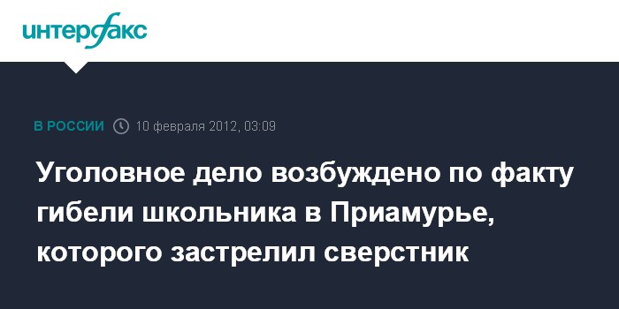 Владивосток. 10 февраля. ИНТЕРФАКС-ДАЛЬНИЙ ВОСТОК - Следственные органы Приамурья возбудили уголовное дело в связи с гибелью 13-летнего школьника в поселке Дипкун огнестрельного ранения.