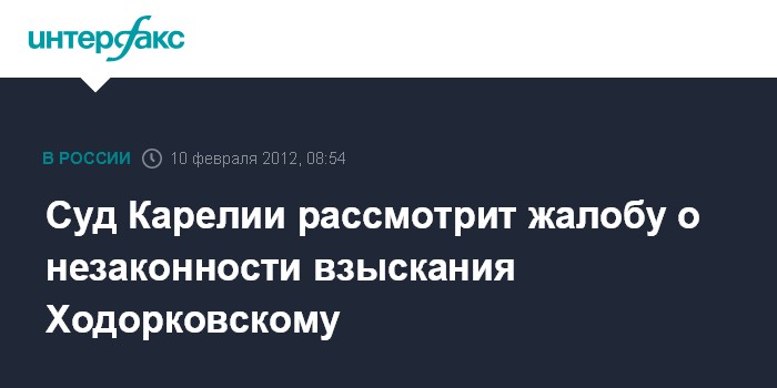 Москва. 10 февраля. INTERFAX.RU - Верховный суд Карелии рассмотрит жалобу на решение о незаконности выговора бывшему руководителю НК "ЮКОС" Михаилу Ходорковскому, сделанного ему в колонии за отсутствие на рабочем месте.
