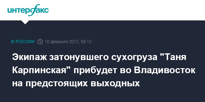 Владивосток. 10 февраля. INTERFAX.RU - Экипаж затонувшего у берегов Японии российского сухогруза "Таня Карпинская" вернутся во Владивосток самолетом в субботу или воскресенье, сообщил агентству "Интерфакс-Дальний Восток" представитель компании-арендатора судна ООО "Восточный путь"