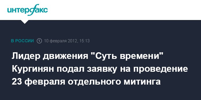 Москва. 10 февраля. INTERFAX.RU - Движение "Суть времени" намерено провести отдельный митинг 23 февраля, сообщил лидер движения Сергей Кургинян.