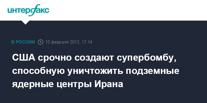 Вашингтон. 10 февраля. INTERFAX.RU - Соединенные Штаты в спешном порядке создают самую мощную в мире неядерную бомбу, которая бы гарантированно смогла уничтожить ядерные центры и хранилища Ирана, находящиеся глубоко под землей или в горных туннелях, сообщают местные СМИ.