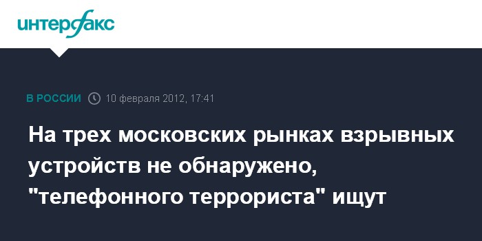 Москва. 10 февраля. INTERFAX.RU - Угроза взрыва не подтвердилась ни на одном из трех столичных рынков Москвы, о минировании которых сообщал в пятницу днем неизвестный, сообщил "Интерфаксу" источник в правоохранительных органах.