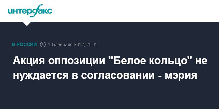 Москва. 10 февраля. INTERFAX.RU - В мэрии Москвы заявили, что акция оппозиции, планирующей 26 февраля, взявшись за руки, выстроиться в цепочку по всему протяжению Садового кольца, не требует согласования.