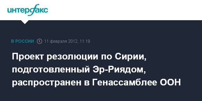 Дубай. 11 февраля. INTERFAX.RU - Саудовская Аравия в ночь на субботу распространила среди членов Генеральной Ассамблеи ООН проект резолюции в поддержку арабского плана по Сирии, сообщил дипломатический источник межарабскому телеканалу "Аль-Арабийя". Это произошло неделю спустя после того, как Россия и Китай заблокировали в СБ ООН принятие аналогичного проекта. Телеканал напоминает, что права вето в ГА ООН нет и что резолюции Ассамблеи носят рекомендательный характер.