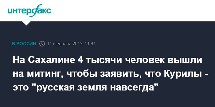 Южно-Сахалинск. 11 февраля. INTERFAX.RU - Митинг "Курилы наши - и точка!", организованный сахалинским объединением профсоюзов, прошел в субботу днем в Южно-Сахалинске на площади Победы. По данным УМВД, несмотря на почти 20-градусный мороз, он собрал на площади около 4 тыс. человек.
