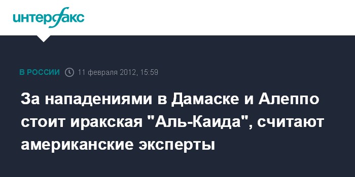 Вашингтон. 11 февраля. INTERFAX.RU - За недавними атаками в сирийских городах Дамаске и Алеппо стоит иракское подразделение "Аль-Каиды", сообщает в субботу американский газетный холдинг "МакКлатчи Ньюспейперс", ссылаясь на неназваных американских официальных лиц. По данным холдинга, эта информация доказывает заявления президента Сирии Башара Асада относительно того, что "Аль-Каида" имеет отношение к вооруженным оппозиционерам, выступающим против сирийских властей в Дамаске.