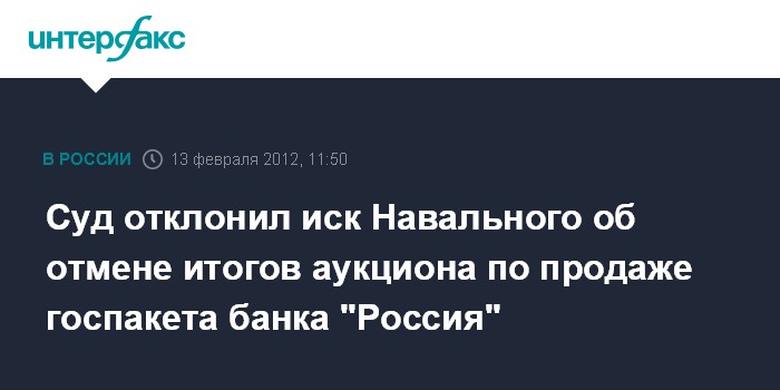 Москва. 13 февраля. INTERFAX.RU - Суд отказал Алексею Навальному в удовлетворении иска об отмене итогов аукциона по продаже госпакета банка "Россия", который выиграла компания Михаила Шеломова, дальнего родственника Владимира Путина.