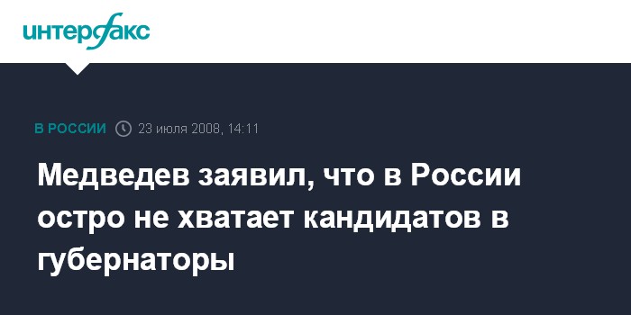 Москва. 23 июля. INTERFAX.RU - Президент России Дмитрий Медведев признает, что в стране существует огромная проблема с подбором кандидатов на должности губернаторов.