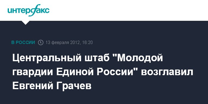 Москва. 13 февраля. INTERFAX.RU - Новым руководителем центрального штаба "Молодой гвардии Единой России" (МГЕР) назначен руководитель Московского отделения МГЕР Евгений Грачев. Он заменил ушедшего на должность и.о. руководителя Центрисполкома "Единой России" Константина Мазуревского.