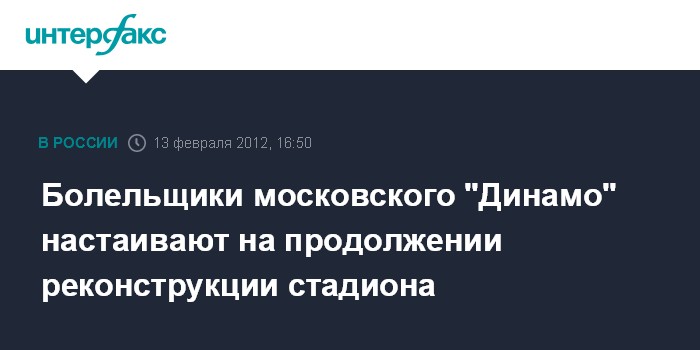 Москва. 13 февраля. INTERFAX.RU – Представители фан-клуба футбольного клуба "Динамо-Москва" настаивают на том, чтобы реконструкция стадиона, реализуемая властями города и инвесторами, продолжалась по заявленному плану.